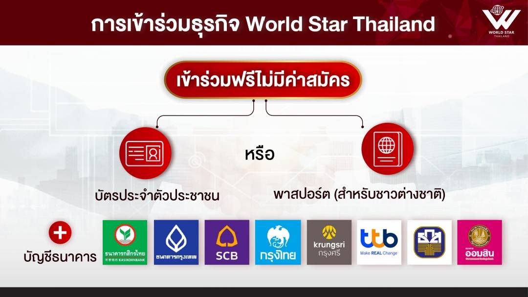 การเข้าร่วมธุรกิจ เวิลด์สตาร์ ไทยแลนด์ ไม่จำเป็นต้องเสียค่าสมัคร และสามารถสมัครได้ง่ายๆบนมือถือของท่านเอง ส่วนสมุดบัญชีธนาคารสามารถใช้ได้ทุกธนาคาร